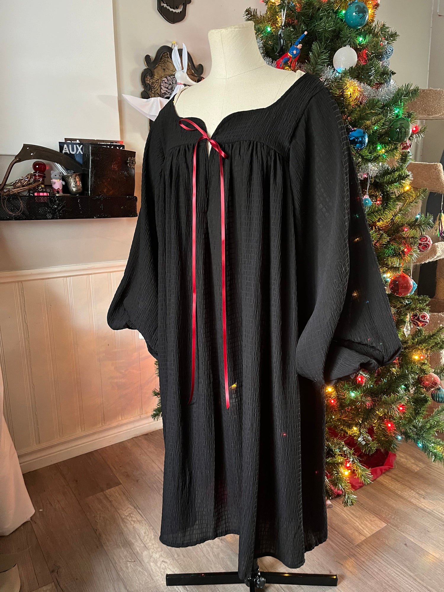 featuring a squared neckline, gathered just above the bust and tied in the front with a small red ribbon. The billowy bishop sleeves are gathered at the wrists with elastic and the dress falls to about knee length