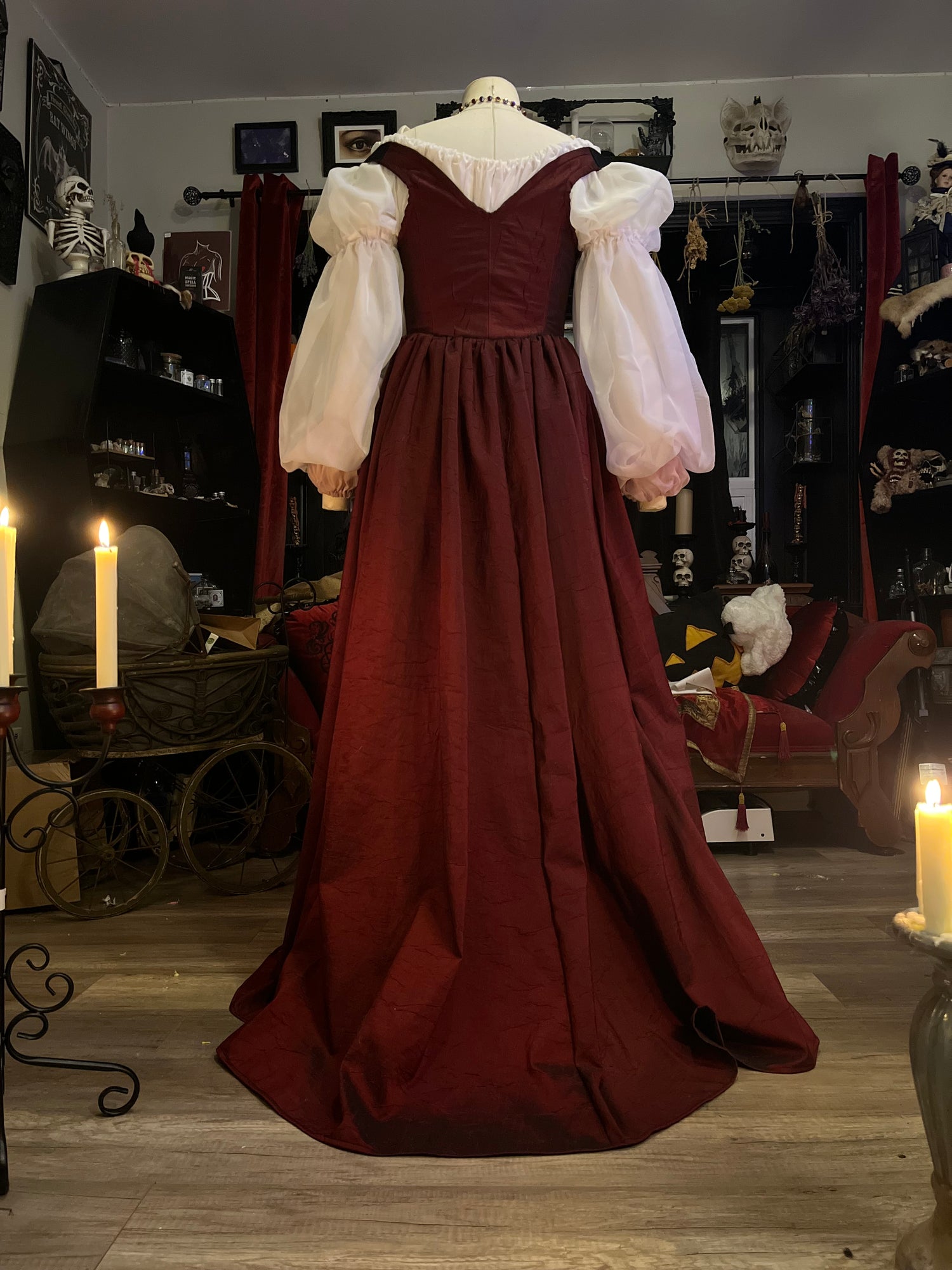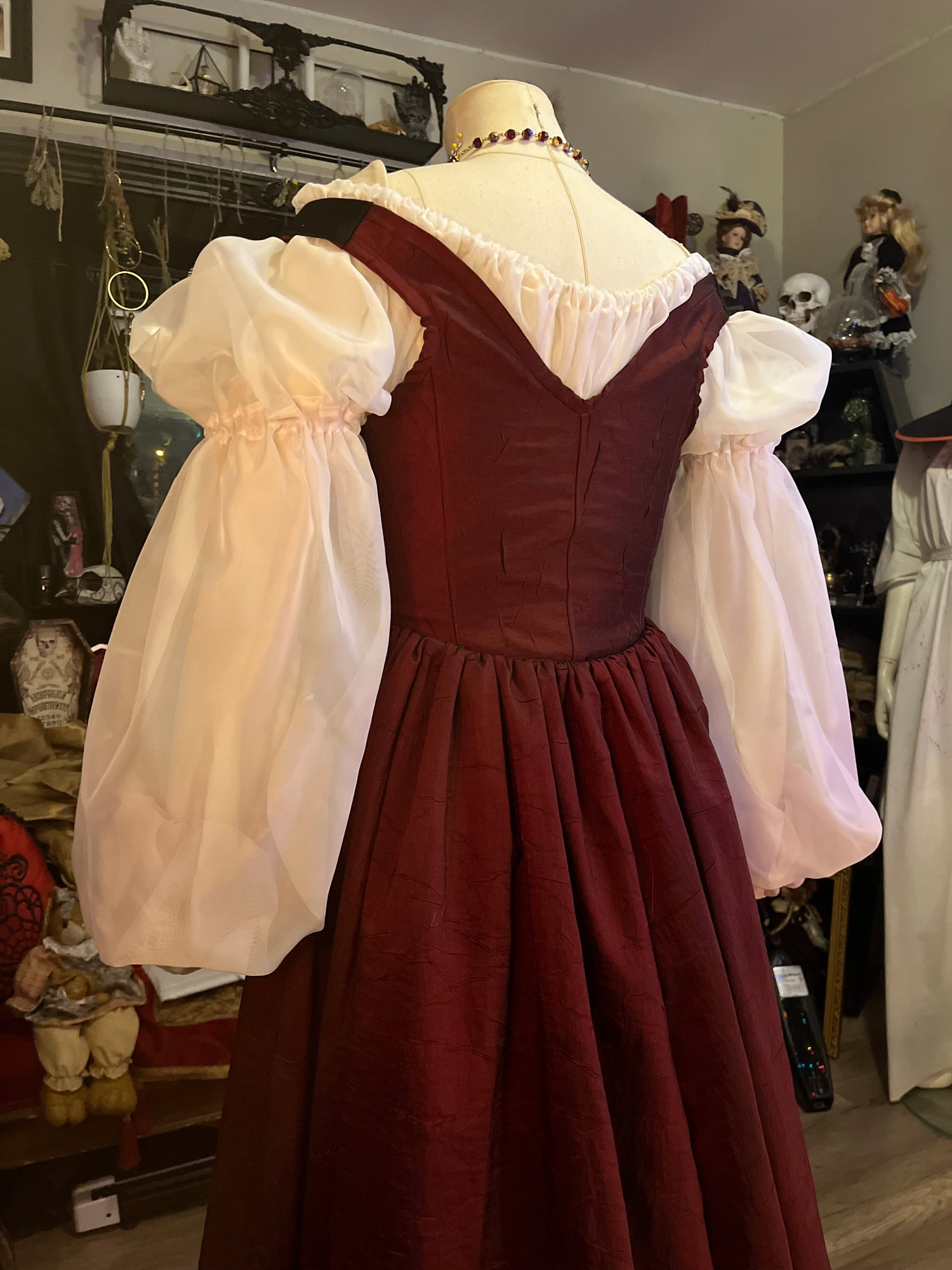 Made in a dark red taffeta, with off the shoulder straps, and full length skirt that opens in the front