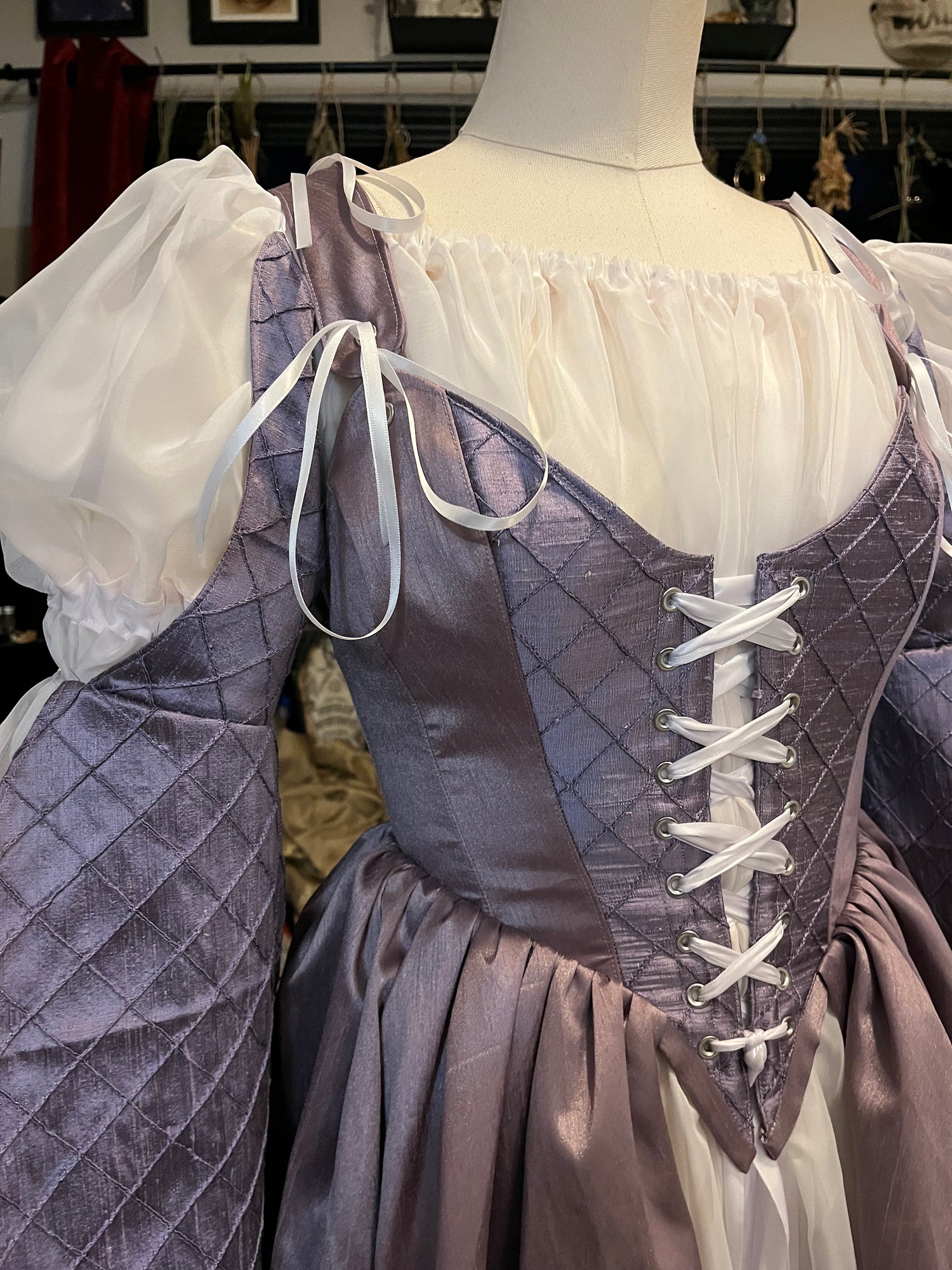 Made in a lilac imitation silk dupioni, with real silk quilted dupioni as the centre piece and sleeves. With adjustable shoulder straps, and a full length skirt that opens in the front